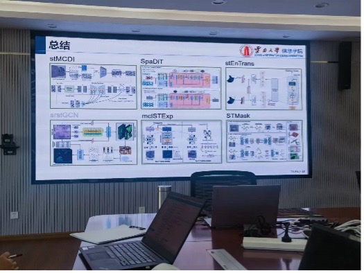 闵文文副教授作“面向空间转录组学数据的智能方法研究”的报告,介绍了空间转录组学的问题和背景、本领域研究面临的主要挑战,分别针对空白点填充、少样本切片预测、切片数据增强、基因表达预测和功能分类与知识发现等问题,介绍了近期开展的工作,也介绍了生物信息和计算机领域论文组织及写作的特点,与青年教师代表、参会同学就空间转录组学数据量、序列位置信息、数据切片形式、神经网络模型扩展等问题展开了深入的交流和讨论。同时,参会人员也就相关领域高水平论文发表、科研项目合作申报等工作,给出了建议、进行了经验分享,探讨了实验室未来在这一新兴研究领域壮大科技力量的思路。