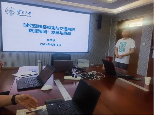 赵苡积博士作“时空图神经模型与交通网络数据预测:发展与挑战”的报告,从时空图神经模型与交通网络数据预测的问题和背景出发,就多图学习、自适应图学习、动态图学习以及时空联合模型等代表性时空图神经网络发展方向,结合所从事研究工作进行了详细介绍,针对网络异质性、数据分布漂移、数据可靠性验证、以及大规模网络等4项典型挑战,给出元学习、Transformer、参数库、对比学习、模式扩展、概率预测评估和网络约减等未来重点关注的研究方向和研究思路。他的研究引发了与会人员的浓厚兴趣,大家积极提问和交流,共同探讨了数据集与数据安全、迁移模型应用、流量和轨迹数据预测等领域前沿问题。